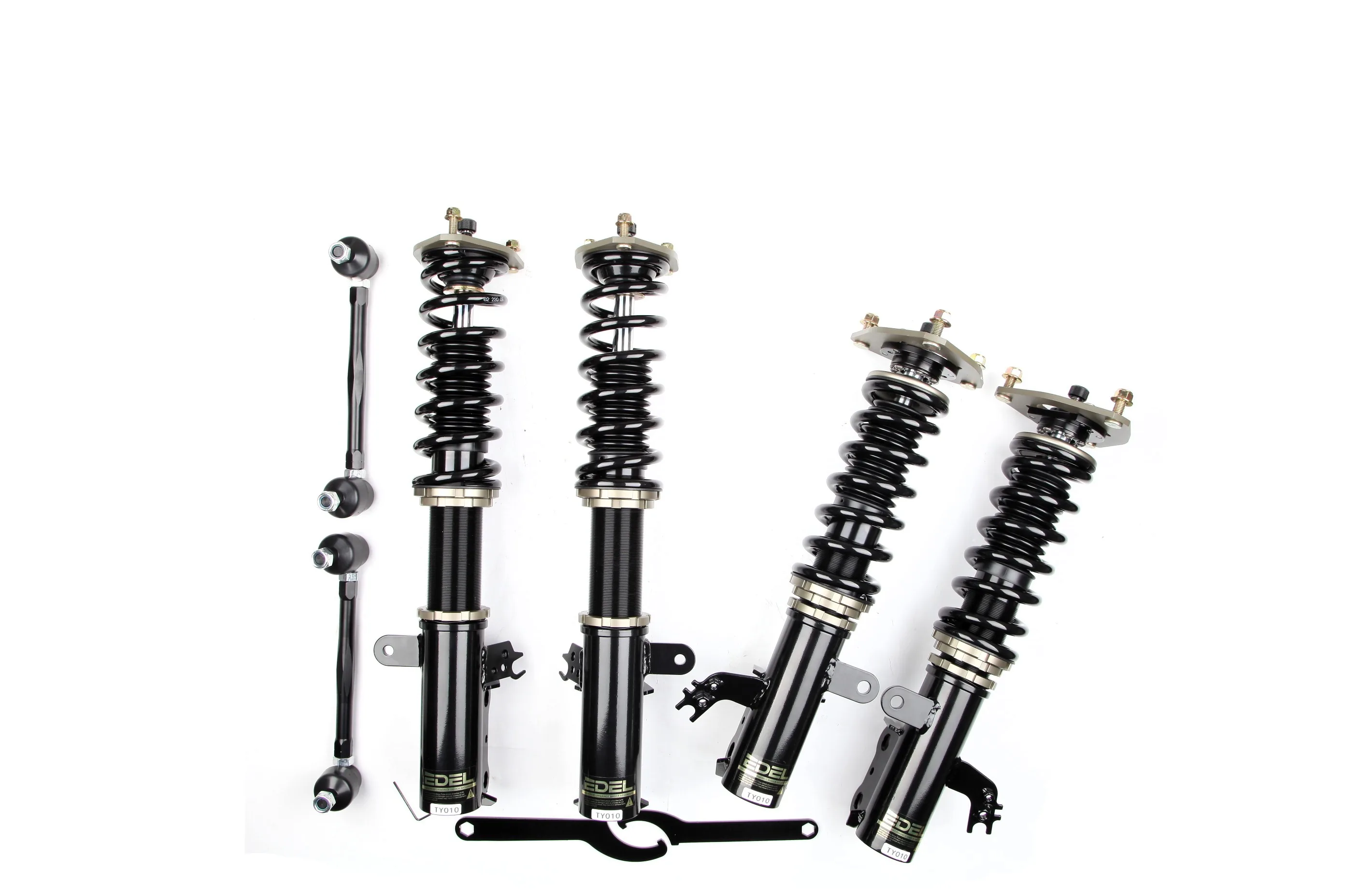 Пружины перед 8 кг, зад 6 кг. Полный комплект регулируемых амортизаторов перед + зад (4шт). Задние койловеры без шаровых соединений (на резиновых втулках). Фултап, регулировка высоты и жесткости 32 щелчка. Производство в г. Шанхай. Собственный завод.