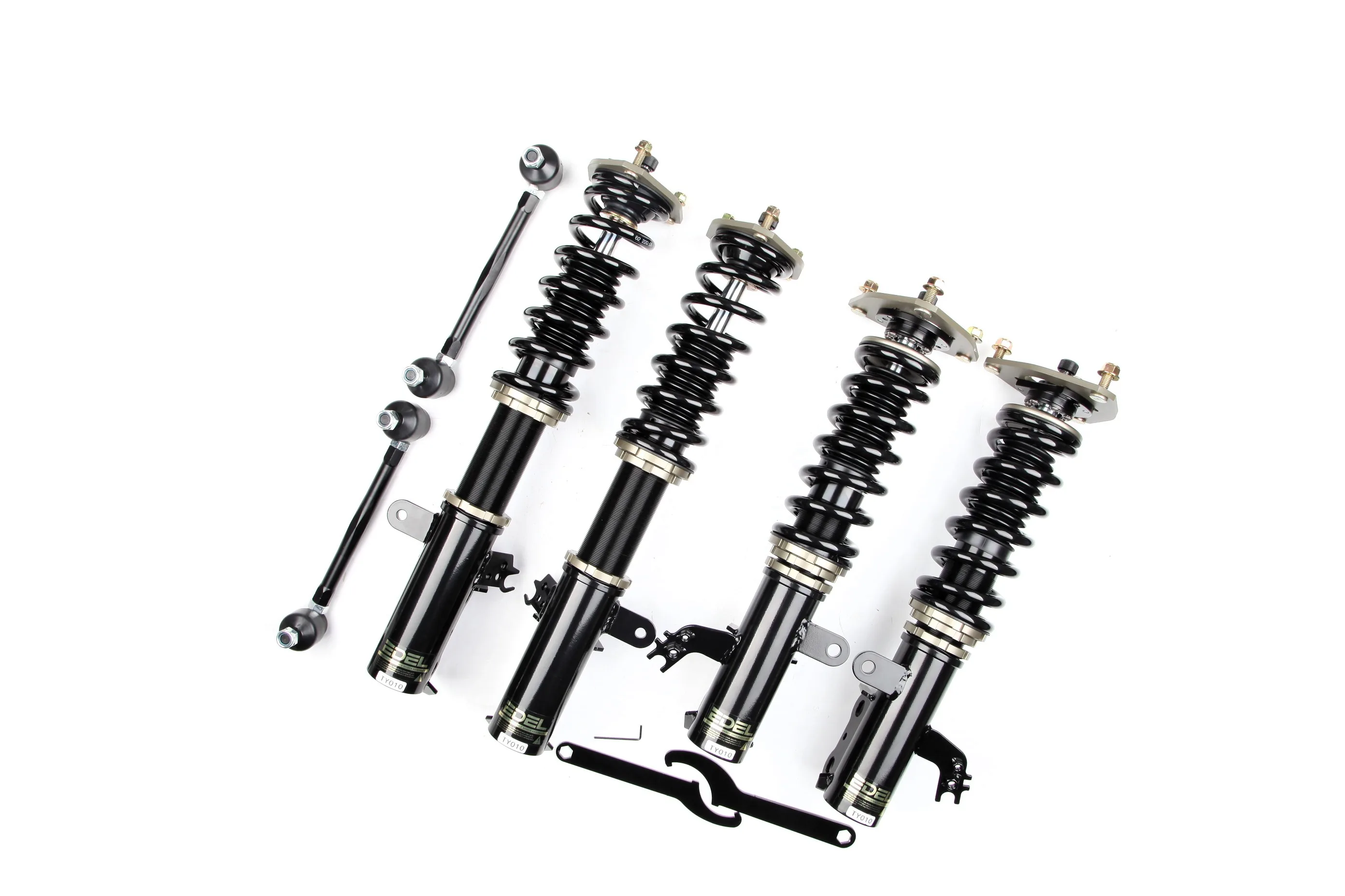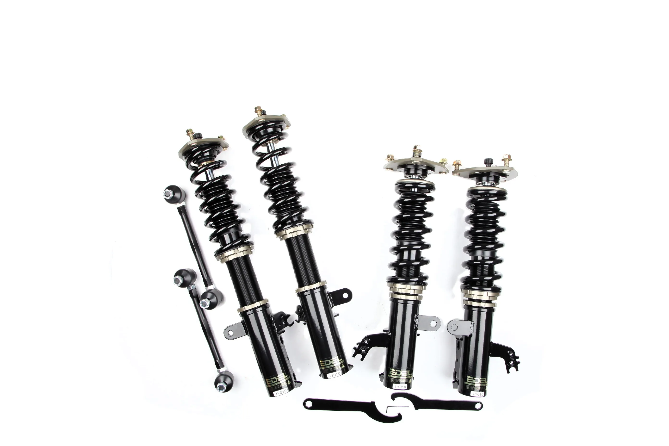 Пружины перед 8 кг, зад 6 кг. Полный комплект регулируемых амортизаторов перед + зад (4шт). Задние койловеры без шаровых соединений (на резиновых втулках). Фултап, регулировка высоты и жесткости 32 щелчка. Производство в г. Шанхай. Собственный завод.